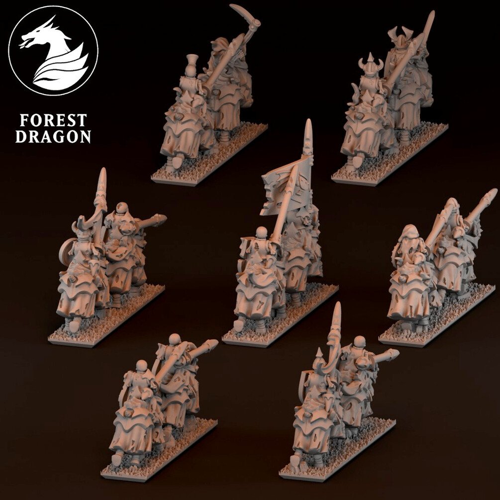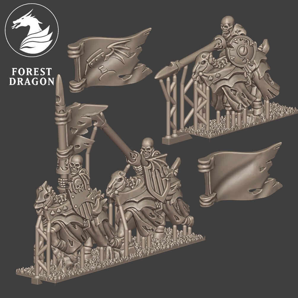 Skeleton knight regiment in 10 mm scale. Files are provided fully supported and are intended to be printed with the bases flat to the build plate of your resin 3D printer. Just slice and hit print!
