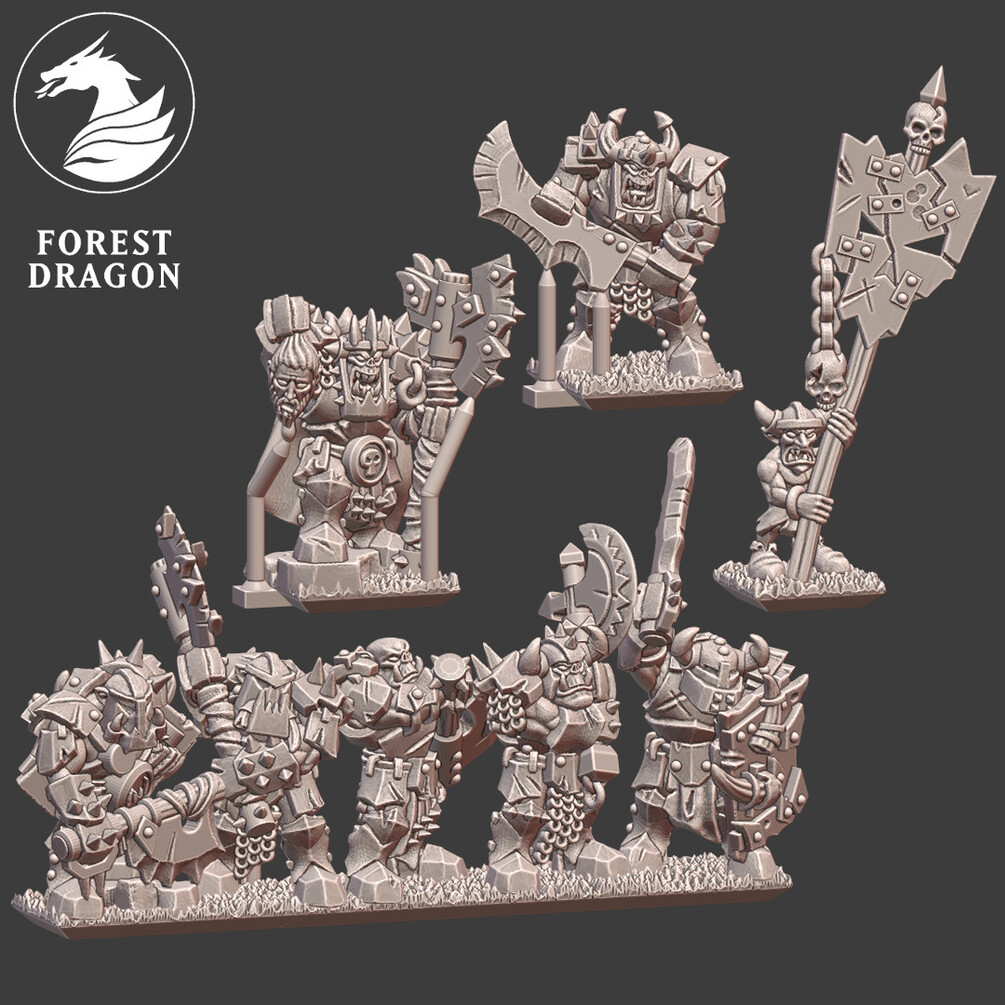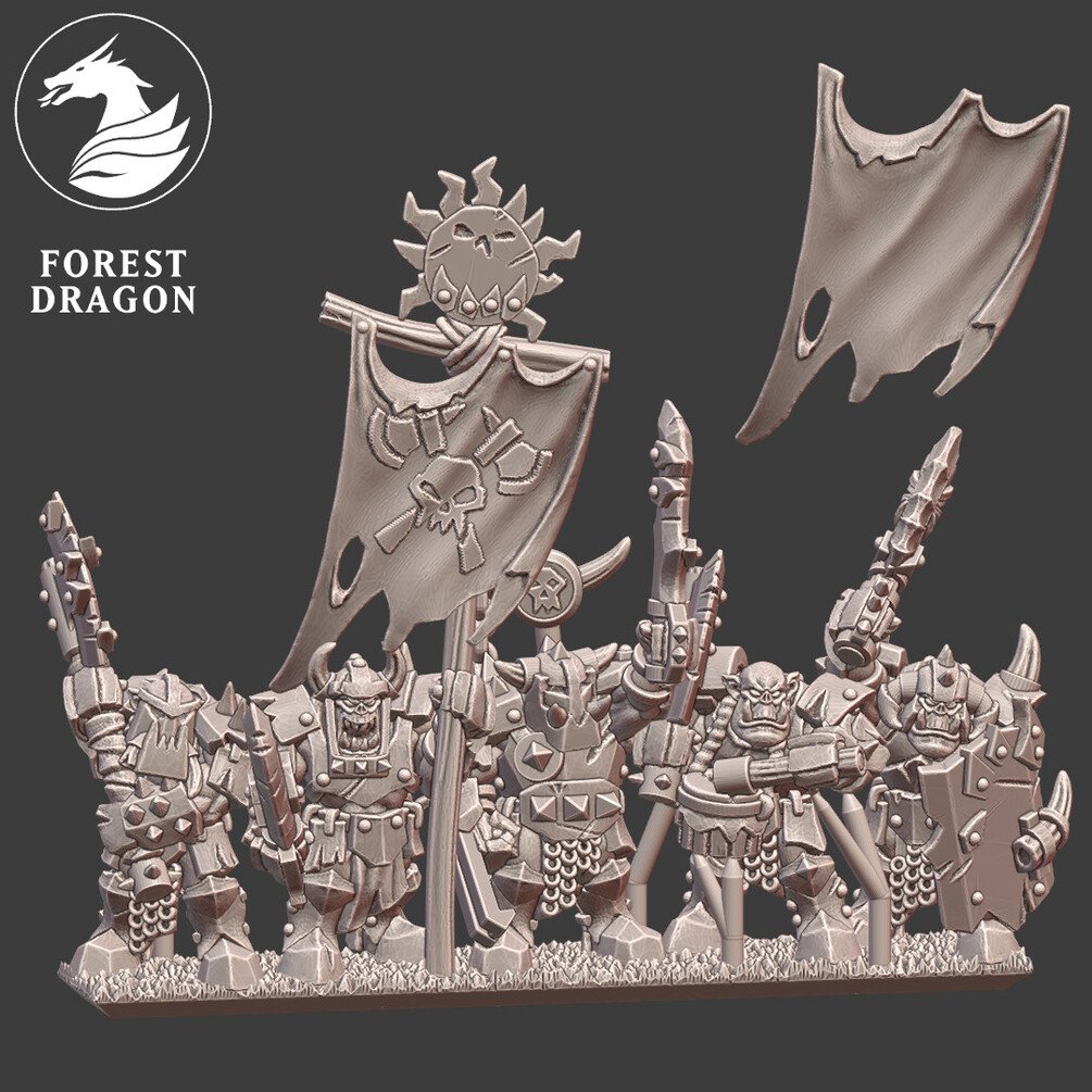 Heavy orc infantry regiment in 10 mm scale. Files are provided fully supported and are intended to be printed with the bases flat to the build plate of your resin 3D printer. Just slice and hit print!