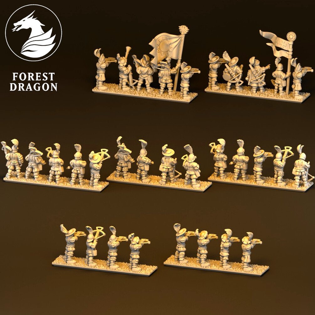 Crossbow regiment in 10 mm scale. Files are provided fully supported and are intended to be printed with the bases flat to the build plate of your resin 3D printer. Just slice and hit print!