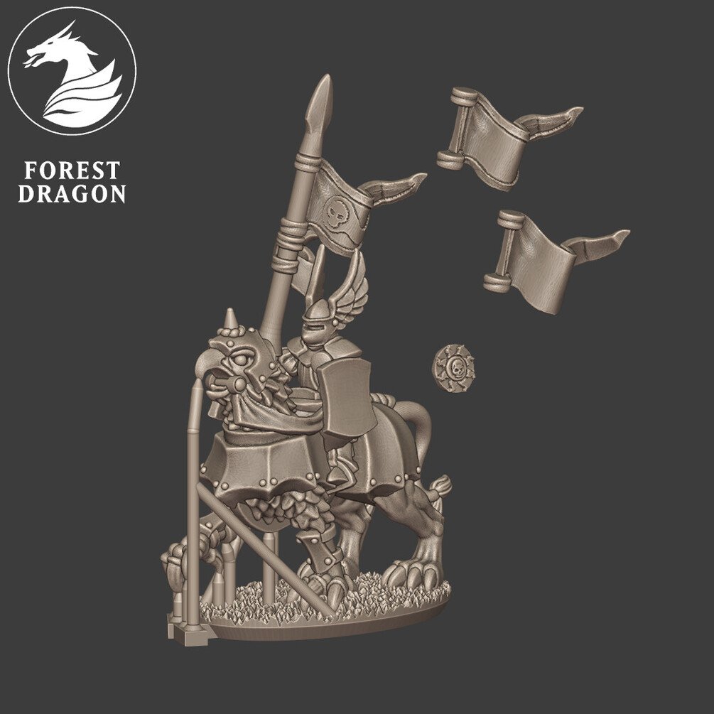 The 6 knights are provided individually based and supported, with an included 40 x 20 mm base with recesses suitable for mounting 2 knights per base. There is the option to print shields and banners with sculpted detail or blank for your own designs.
