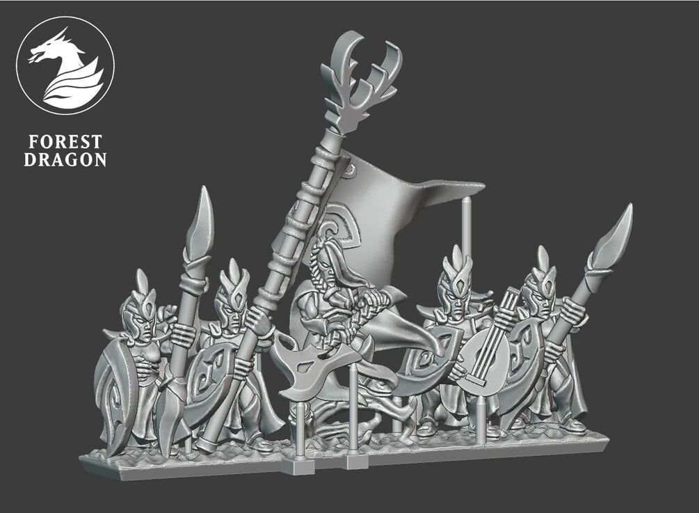 Wood elf spear regiment in 10 mm scale. Files are provided fully supported and are intended to be printed with the bases flat to the build plate of your resin 3D printer. Just slice and hit print!