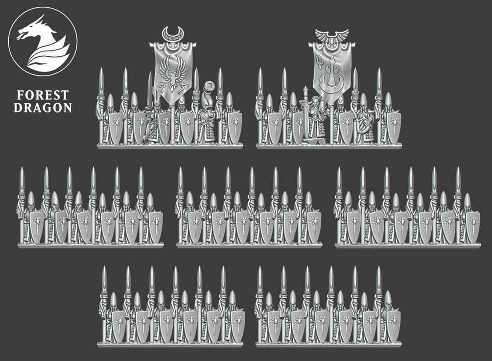 Noble elf spear infantry regiment in 10 mm scale. Files are provided fully supported and are intended to be printed with the bases flat to the build plate of your resin 3D printer. Just slice and hit print!