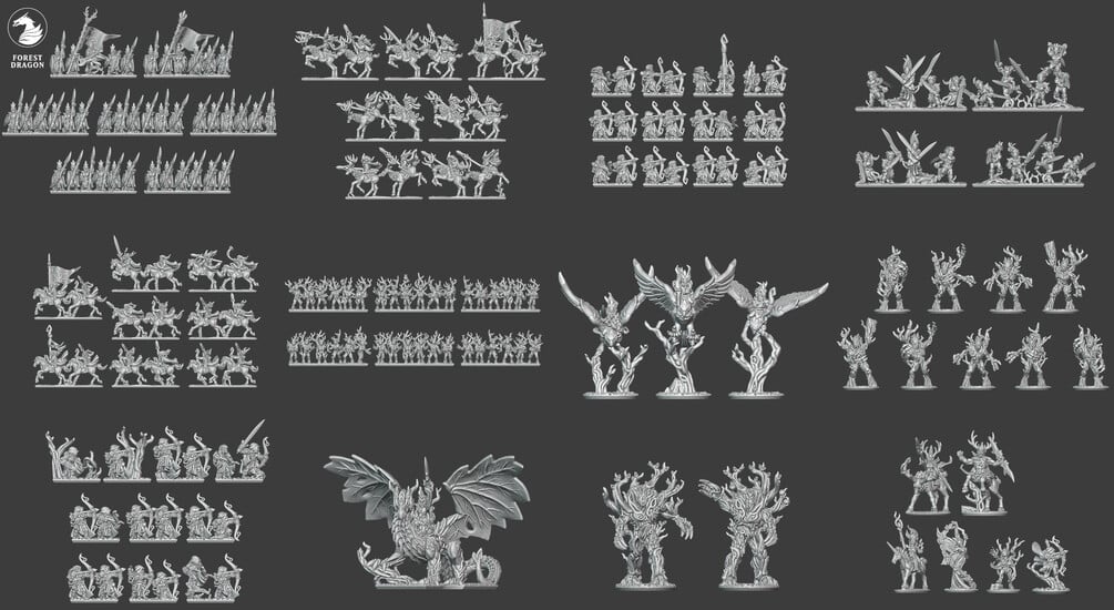 Wood elf army in 10 mm scale. Files are provided supported and are intended to be printed with the bases flat to the build plate of your resin 3D printer. Just slice and hit print!