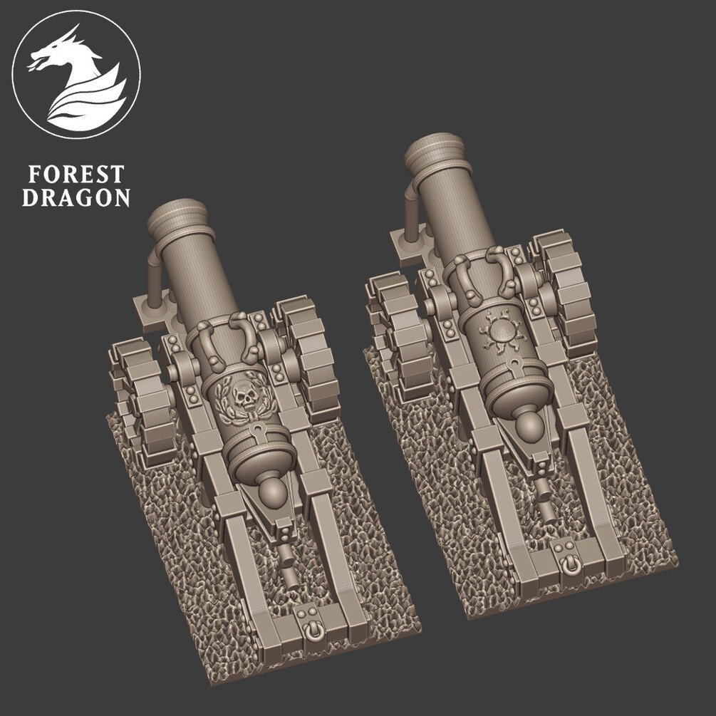 The artillery are provided as based and supported single pieces and the crew are provided as based individuals. The cannon has the option of two sculpted icons or the barrel can be left blank. 40 x 20 mm bases with recesses suitable for the artillery and crew are also included.