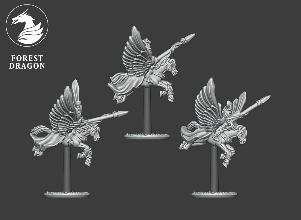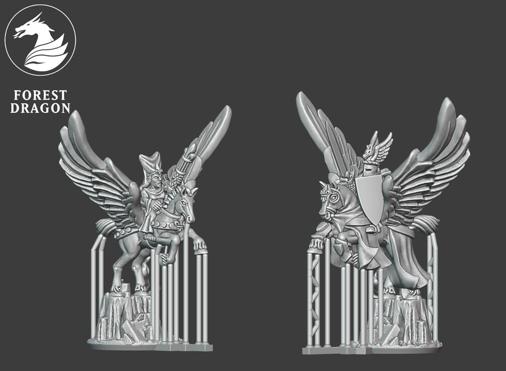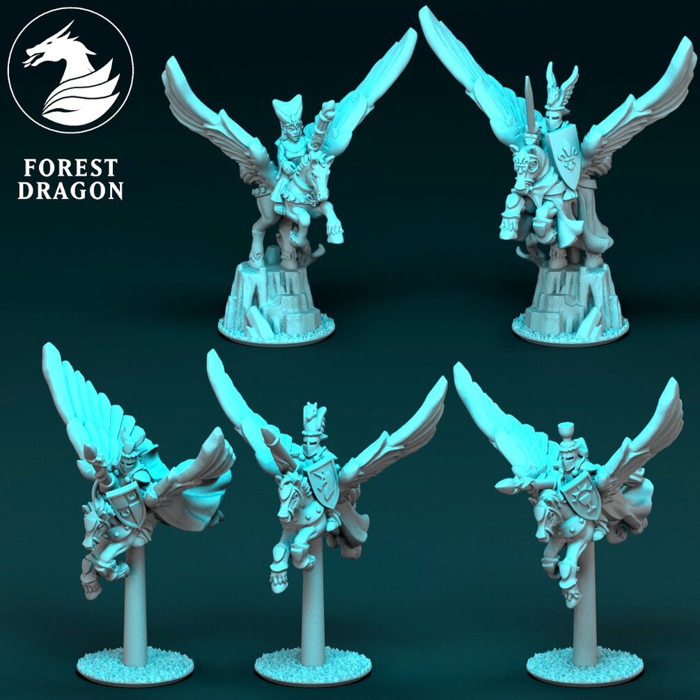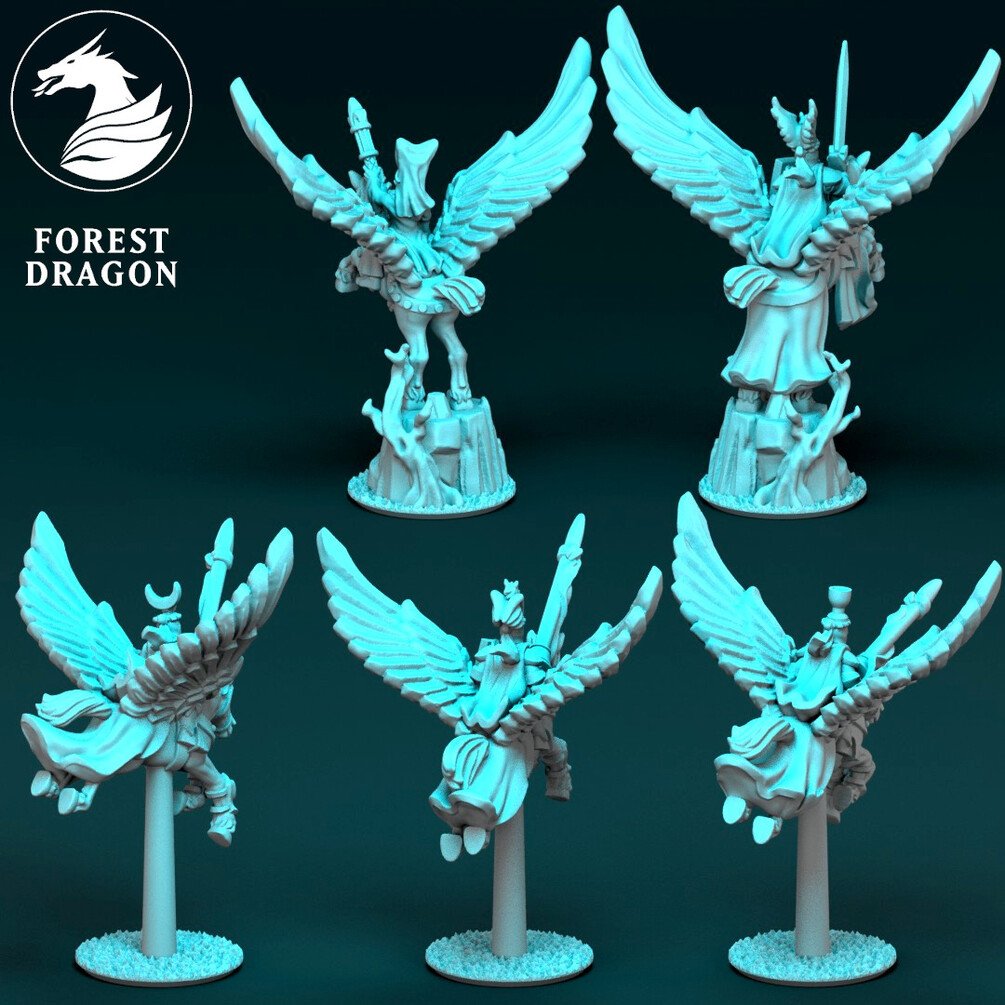 Pegasus knights in 10 mm scale. Files are provided fully supported and are intended to be printed with the bases flat to the build plate of your resin 3D printer. Just slice and hit print!