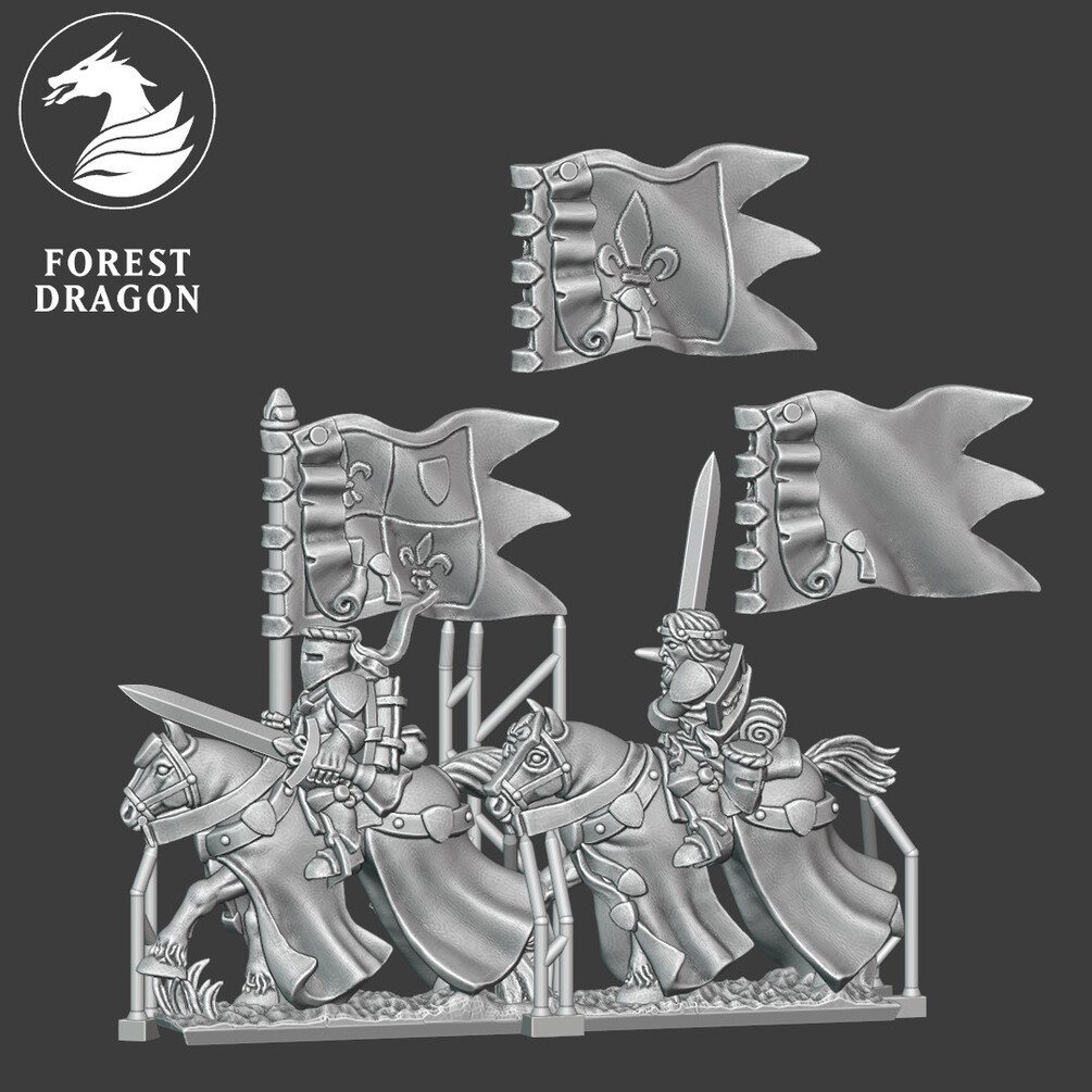 There is a choice of command stands and a choice of banner designs, or you can leave the banner blank to paint your own design. The miniatures are provided with blank shields as well as with sculpted heraldry.